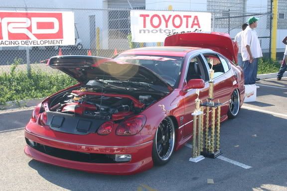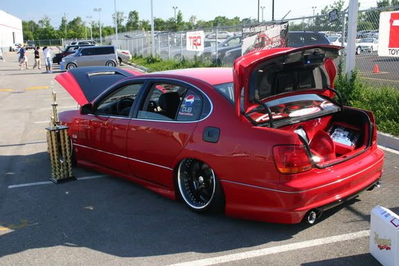 This guy won best of show with his GS400 sponsored by Circuit City, Pepsi and DUB. It's a bit off the hook. Monitors in the sunvisors, headrests and trunk; OK. But two in the engine compartment and one ON the fuel filler door?