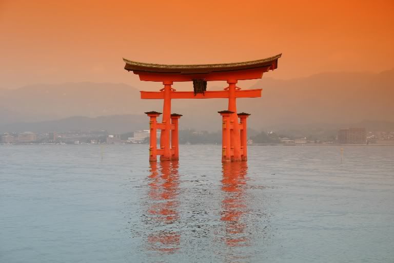 - SLRs: Cokin makes a whole catalog of easy (and cheap) filters. You can take a not-so-special situation and turn it into something awesome. For example: I took this shot on Miyajima Island near Hiroshima, Japan. The day was overcast with high clouds. The Torii is orange in color but doesn't look very special with a greyish background. Even more so, there are buildings and such in the background that I wanted less attention. So I used a gradiant orange filter and pushed it up until I got something that faked a glowing sunset. It brought out the orange Torii without making it look overwhelming.